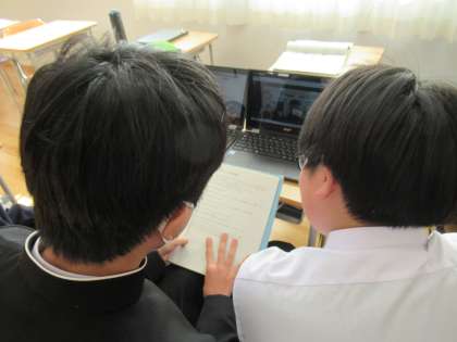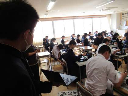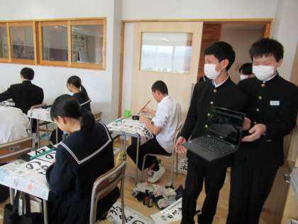12月13日(水) 2年生 英語 マレーシアとのオンライン交流学習 2年2組 その2 公開日 2023/12/13 更新日 2023/12/13 八尾中学校のページ マレーシアの中学校は、Sports Day,Independent Day,School Carnival について紹介しています。 こちらは、体育大会、14歳の挑戦、文化活動発表会について紹介しました。 隣のクラスで書写をしていたので、チャンス!とばかりにchromebookを持って日本文化の紹介をしています。