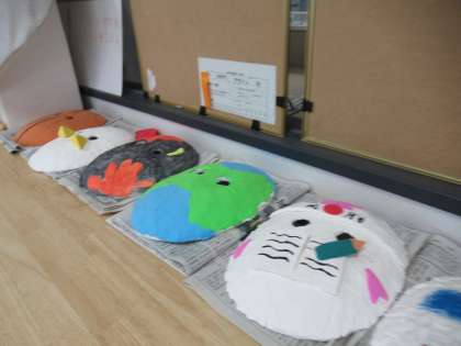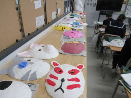 完成した様々な仮面が美術室に展示してあります。懇談会にお越しの際に、よろしければご覧ください。