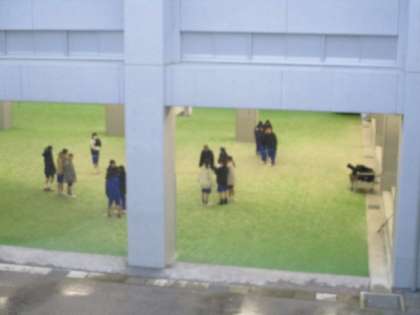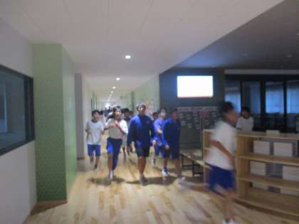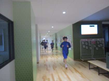 野球部とサッカー部は2階廊下を走り、ソフトテニス部はピロティで活動しています。