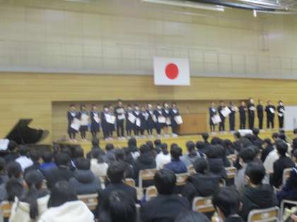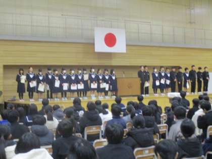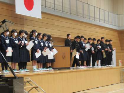 終業式に先立ち、2学期に開催された大会、コンクール等で表彰された生徒達の受賞報告会を行いました。