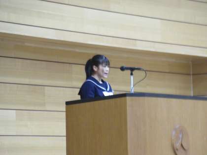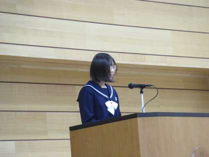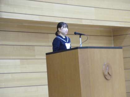 3年生の代表生徒は、おわらに憧れて郷土芸能部に所属し、胡弓の演奏にチャレンジしたこと、チャレンジする中で困難なことにも出会いながらも、共に頑張る仲間と一緒に乗り越えることで、次のチャンスを手にすることができたことについて述べました。