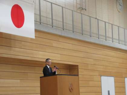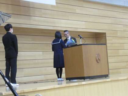 終業式の後、英語の授業や陸上競技部でお世話になった先生の離任式を行いました。