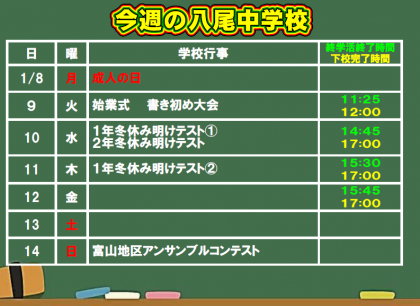 1・2年生は、10日(水)に休み明けテストがあります。3年生は、5日に予定していた確認テストを12日(金)に行います。冬休み中の学習の成果を発揮しましょう!