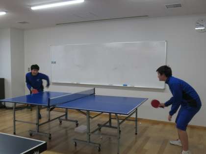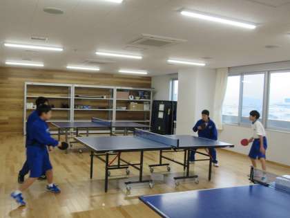 卓球部は、集会室で練習に励んでいます。ラリーが続いています。