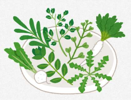 7種類の野菜を刻んで入れたかゆを七草がゆといい、邪気を払い万病を除く占いとして食べるそうです。御節料理で疲れた胃を休め、野菜が乏しい冬場に不足しがちな栄養素を補うという意味もあるようです。