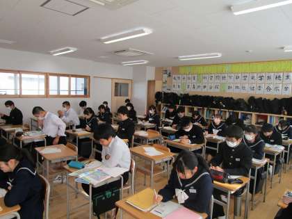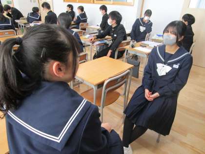 写真下は、3年4組 英語科の授業の様子です。昨日どれくらい学習したかを英語で聞き合っています。