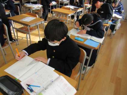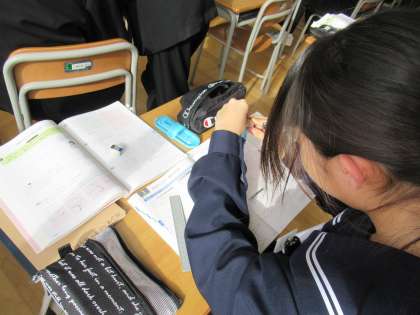 垂線の作図について学習しています。コンパスを使って実際に作図したり、友達と教え合ったりしています。