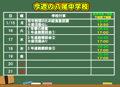 1月15日(月) 今週の八尾中学校