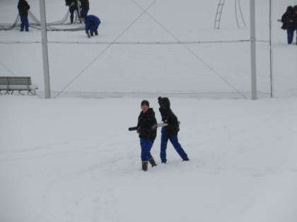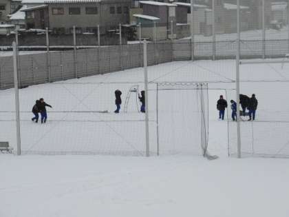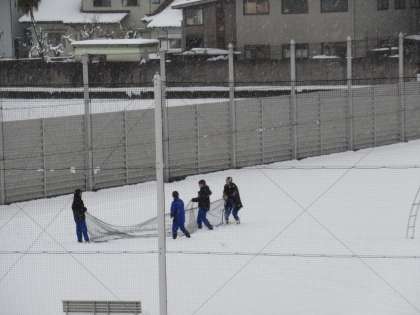 雪の中でトレーニング!?と思いきや、ソフトテニス部はテニスコートのネットとブラシが雪の中に埋まってしまわぬよう移動させています。