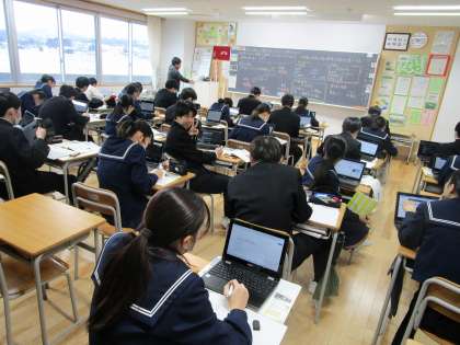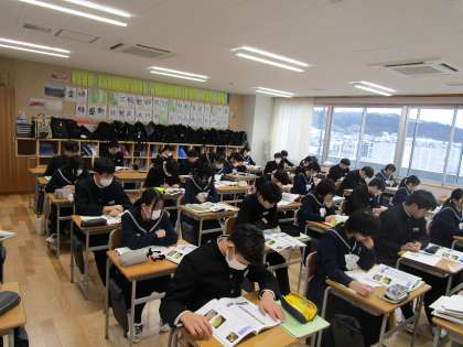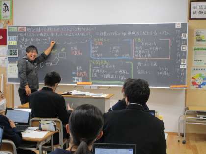 写真下は、社会の授業の様子です。領土問題について学んでいます。