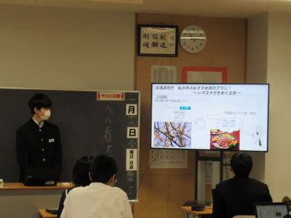 今日は、クラスみんなの前でお勧めの北海道旅行プランを紹介しています。