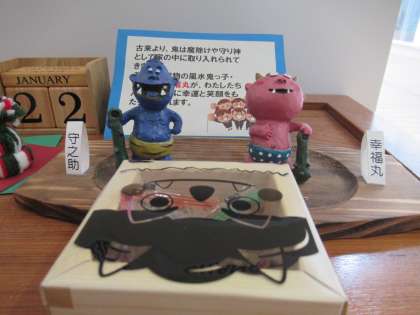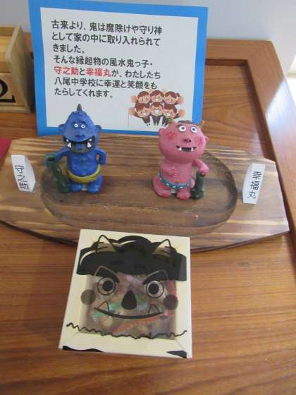 生徒玄関前で、八尾中の安全を守ってくれている2体の鬼、幸福丸と守之助。2月3日の節分が近付いてきました。