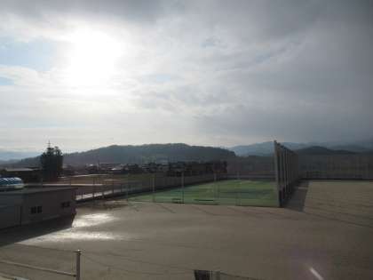 嵐の前の静けさか、グラウンドには太陽が差し込んでいます。
