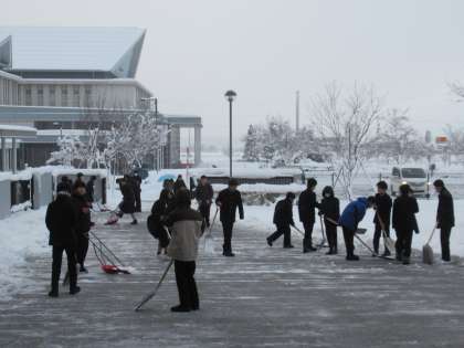 除雪ボランティアの呼び掛けに応えて、たくさんの生徒が朝から除雪を頑張ってくれました。総勢30名以上で除雪をすると、あっという間に前庭がきれいになりました。