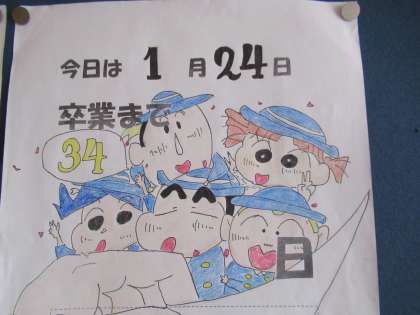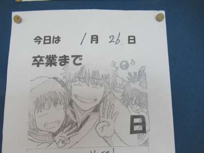 各クラス、一人ずつ卒業まであと○日という日めくりを作成し、教室前に掲示してあります。イラストのクオリティが高いです!