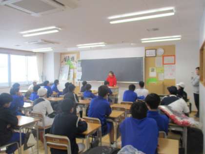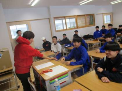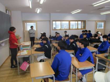 野球部、サッカー部、ハンドボール部が、部活動指導員からビジョントレーニング受けています。初めてのトレーニングに興味津々で話を聞いています。
