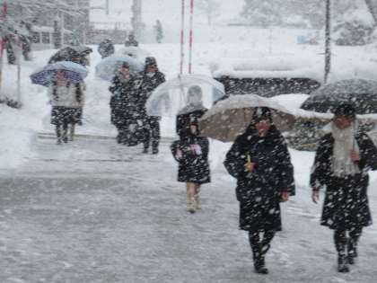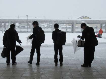 ボランティア除雪隊と用務員さん、柴田理恵号のおかげでピカピカになったところを通って、生徒が元気に登校してきました。