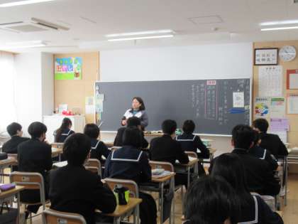 写真上は、国語の授業の様子です。「私を束ねないで」という詩を読み取っています。