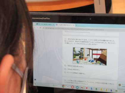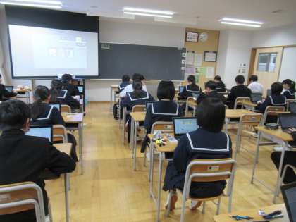 1年生も2年生同様に、chromebookで回答したり、話し合ったりしました。同じ地区に住んでいる生徒同士で、ハザードマップ等を見ながら、避難場所の確認も行いました。