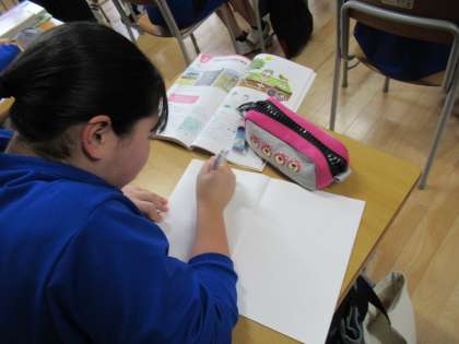 担当の先生が、黒板に木、うさぎ、ライオンの絵を描くと、様々なリアクション。各自ノートに描いていますが、描けそうで意外に難しいようで、盛り上がっています。理科の授業が美術の授業になりそうです。