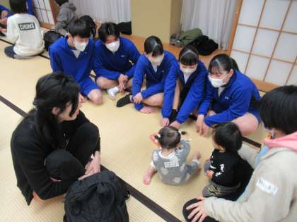 八尾コミュニティセンターの和室をお借りして、総勢18組のお母さんと赤ちゃんをお招きし、「幼児ふれあい体験」を行いました。
