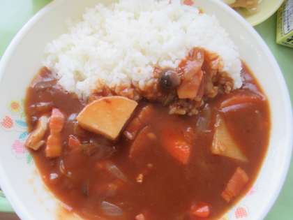 「た」まねぎ、「べ」ーコン、「き」のこ、「リン」ゴが入ったハヤシライスです。