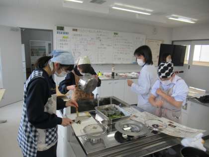今日は、1年3組が調理実習を行っています。栄養教諭、SSSさんもお手伝いしてくださっています。