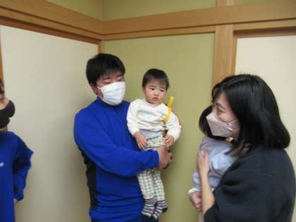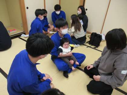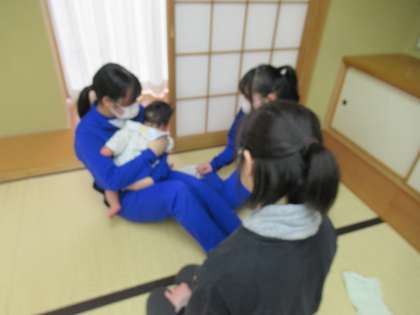 赤ちゃんを抱っこする姿は、もうすっかり若いパパ、ママのようです。小さい弟や妹がいる生徒は、慣れた手付きです。