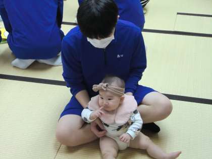 赤ちゃんたちも徐々に慣れてきて、リラックス。生徒も笑顔いっぱいです。優しい表情が印象的です。