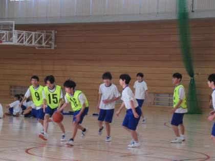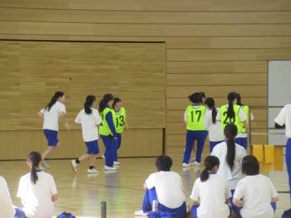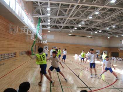 2クラス合同で、バスケットボール競技に取り組んでいます。試合形式で、白熱しています。