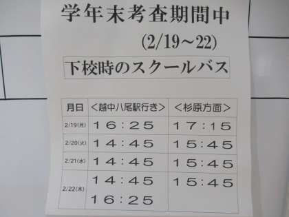 2月21日(水) 学年末考査期間中のバス時刻