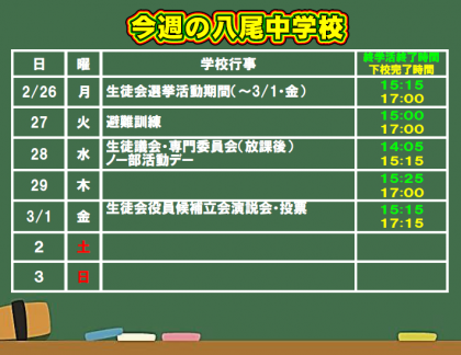 なお、3月からは部活動が15分延長され17:00までに、下校時間は17:15となります。