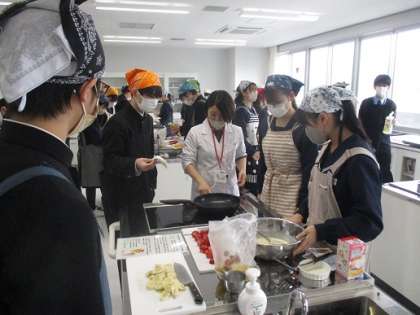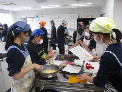 幼児のおやつ作りとして、楽しくクレープを作っています。中学校での、最後の調理実習。思い出に残る味になるでしょう!