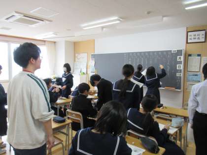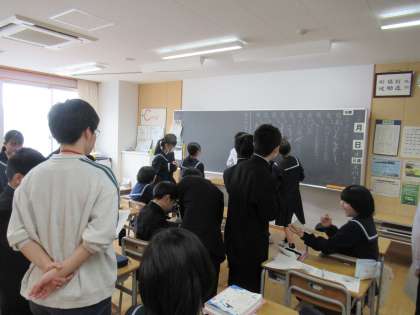 グループ対抗で、先生からのミッションを黒板に書いています。