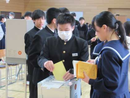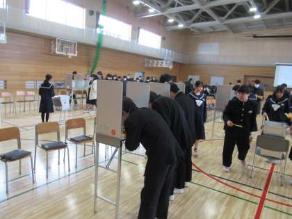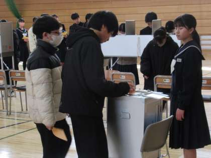 身分証明書で一人一人確認し、投票用紙を渡し、もらった生徒は記入し、投票箱に1票を投じます。緊張感をもって行うことができました。