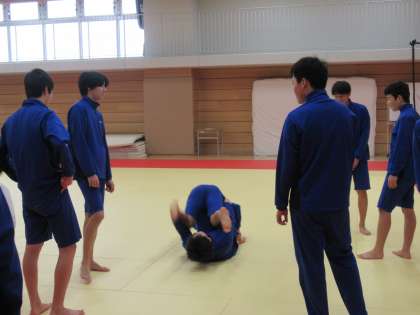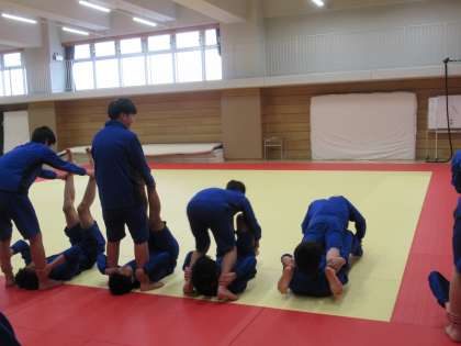 二人1組で前転という難しい技にチャレンジしています。楽しそうにチャレンジしています。