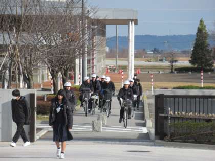 太陽の光が差し込み、暖かい朝です。傘を手に登校してくる生徒が多いです。天気予報を確認していることが伺えます。午後は、雨の予報が出ています。