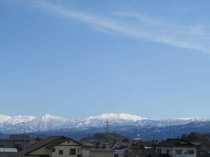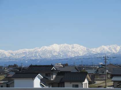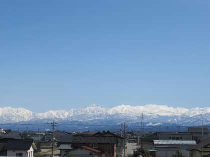 久しぶりの青空の下、立山連峰がくっきり美しく見えます。校歌の歌詞そのものですね。
