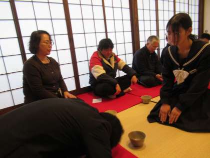 お茶をいただいた後は、肘をつき、茶碗が割れないようにしながら眺めると教えてもらいました。