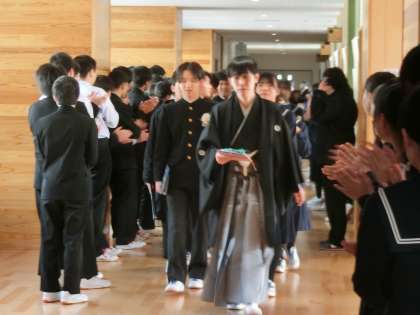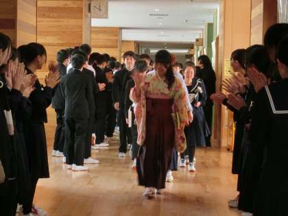 在校生は、各教室前廊下で並び、3年生が2年間過ごした大きな校舎をぐるっと周りながら、生徒玄関へと向かいました。