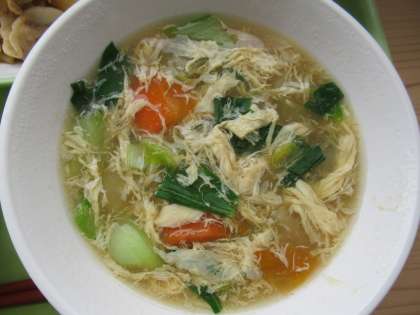 かき玉汁の中に、チンゲンサイや人参、白菜がたっぷり入っていて、美味しいですね。