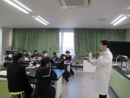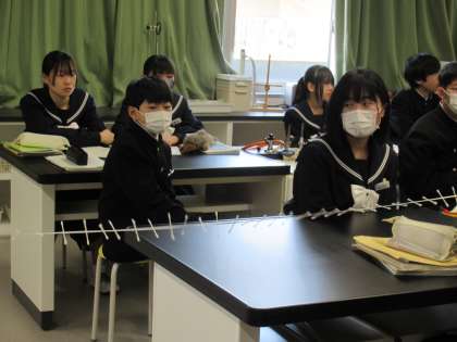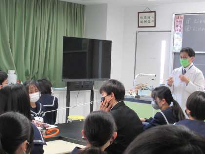 地震について学習しています。綿棒で作った揺れ探知機で、縦揺れと横揺れのどちらの方が速いかを感じとっています。