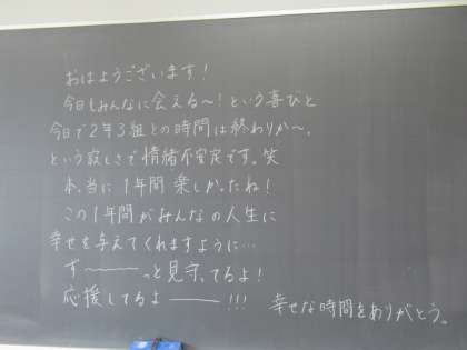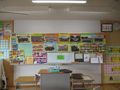 教室の黒板に1年間撮りだめた写真を掲示しているクラス、メッセージが書いてあるクラス、、、と1年間の軌跡がいっぱいです。