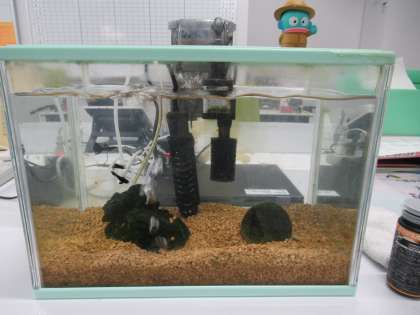 旧1年3組の2匹の黒い金魚も、春休み中は職員室へ。新学期が始まるまで帰省中です。