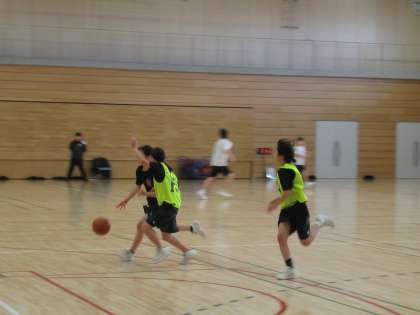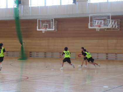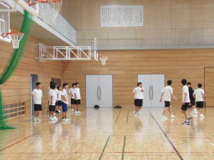 体育館では、バスケットボール部が試合形式で練習をしています。