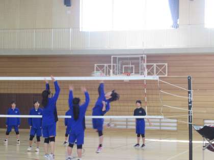 バレーボール部は、2チームに分かれて試合形式で練習しています。体育館に先生が来られると、ぱっと動作を止めて「こんにちわ」とさわやかに挨拶ができる素敵な部です。