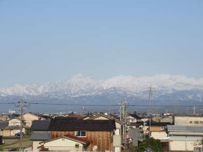 晴れた日、校舎から見える立山連峰は、校歌の歌詞のとおり、「雄々しいその姿光輝」いて見えます。