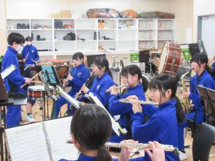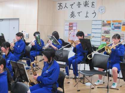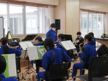吹奏楽部は、入学式に向けて練習をしています。美しい音色を響かせるよう、姿勢に気を付け、丁寧に音出しをしています。