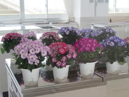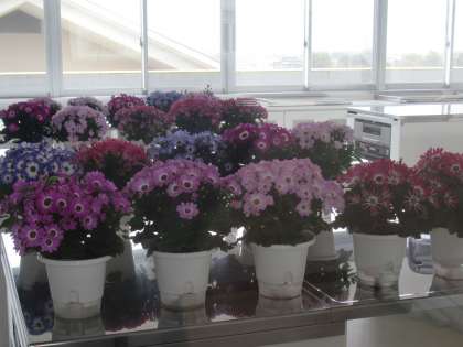 卒業式で、会場を華やかにしてくれたサイネリアは、家庭科室でスタンバイしています。