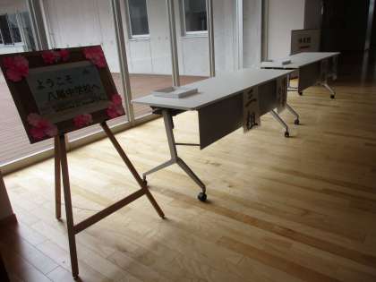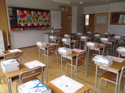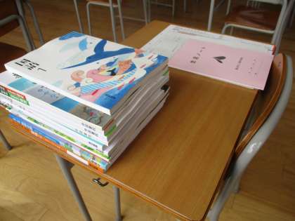 教室の机の上には、新しい教科書や配付物が並べてあります。